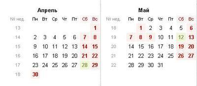 В соответствии с Постановлением Правительства Российской Федерации от 15 марта 2012 г. №201 "О внесении изменения в постановление Правительства Российской Федерации от 20 июля 2011 г. №581" сообщаем график работы в выходные и праздничные дни апреля и мая 2012 года: